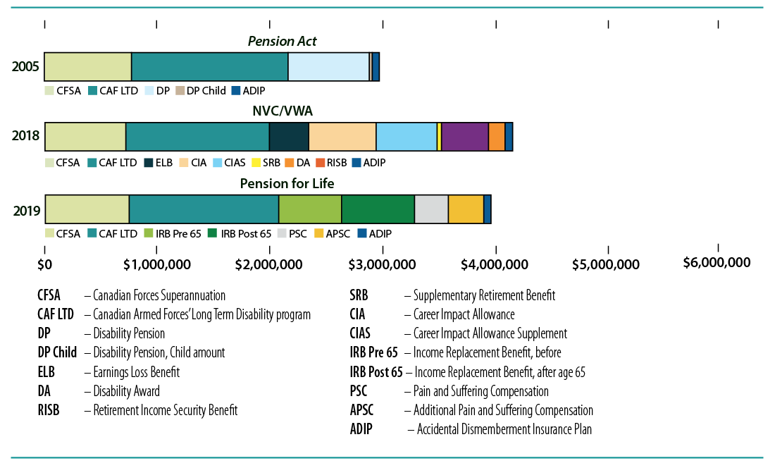 The NVC replaced the Pension Act in 2006 for CAF Veterans who applied for benefits after April 1 of that year.Footnote 2 This new regime introduced major changes to financial compensation benefits. The programs available to CAF Veterans under the Pension Act, such as the Disability Pension (DP), were replaced by a new suite of programs including a lump sum Disability Award (DA) and a medical/vocational rehabilitation program that included an Earnings Loss Benefit (ELB). The DA compensated for pain and suffering while the ELB compensated for economic loss.Footnote 3 The 2006 NVC benefit regime resulted in clear inequities in the amount of financial support offered when compared to the Pension Act.