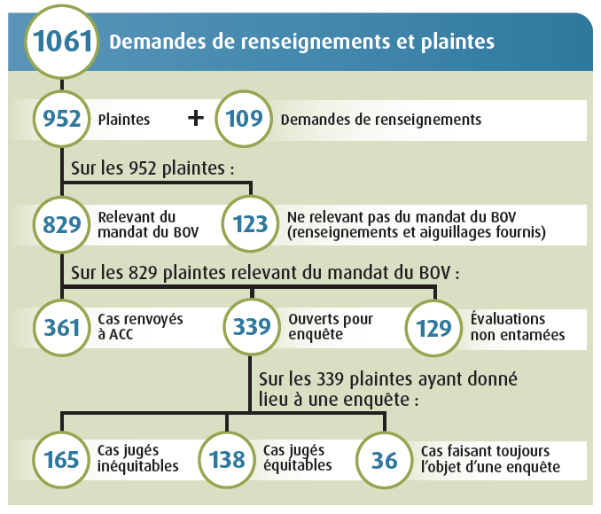 - Ne relevant pas du mandat du BOV (renseignements et aiguillages fournis) : 123