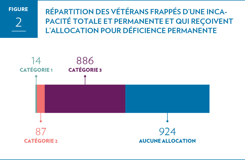 Comme il a été mentionné plus tôt, 1 911 vétérans frappés d’une incapacité totale et permanente souffrent d’un problème de santé qui les empêche de retourner au travail et d’occuper un emploi rémunérateur et convenable. Cependant, malgré leur incapacité, près de la moitié de ces vétérans ne touchent pas l’allocation pour déficience permanente et ne sont par conséquent pas admissibles au supplément.
