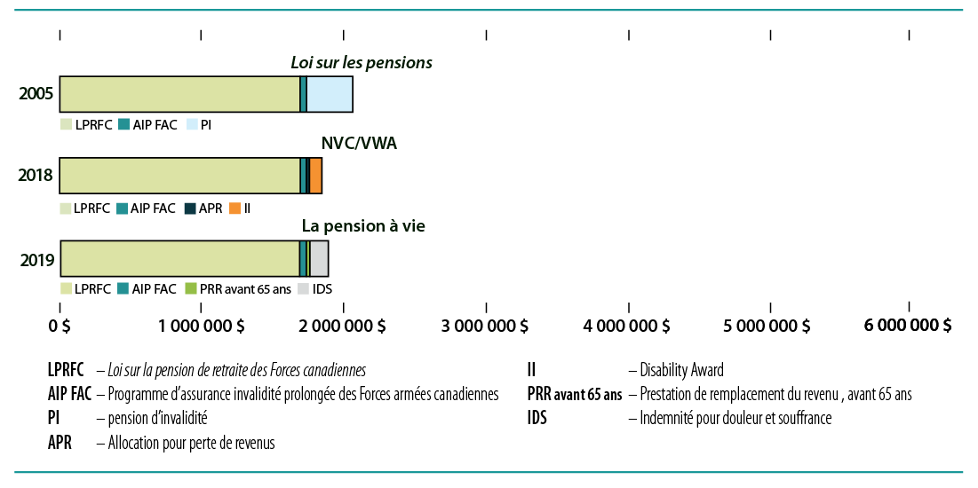 Dans certains cas, la pension à vie offre une indemnisation plus généreuse que les régimes précédentsNote de bas de page 21. Ce résultat s’explique notamment par l’introduction de l’ IDS et l’option de recevoir des paiements mensuels à vie, qui augmente l’indemnisation à vie pour les vétérans blessés tôt dans leur carrièreNote de bas de page 22. Une autre explication est liée à la pension de retraite versée sous le régime de la LPRFC. Dans certains cas, la durée de service est trop courte pour permettre de recevoir une pension de retraite substantielle. Si la durée de service avait été plus longue, et donc le montant versé en vertu de la LPRFC plus élevé, la Loi sur les pensions offrirait probablement une plus grande indemnisation à vie simplement parce que la pension de retraite n’est pas déduite des pensions d’invalidité, mais plutôt déduite intégralement des avantages liés à des pertes financières offerts en vertu de la NCAC/LBV et de la pension à vieNote de bas de page 23. Ainsi, dans certains cas, les vétérans ayant une DCG et qui ont été très gravement blessés au début de leur carrière peuvent recevoir davantage au titre de la pension à vie qu’au titre de la Loi sur les pensions. En d’autres termes, l’absence de pension de retraite importante entraîne un soutien financier d’ ACC plus important sous le régime de la pension à vie que dans les régimes précédents.